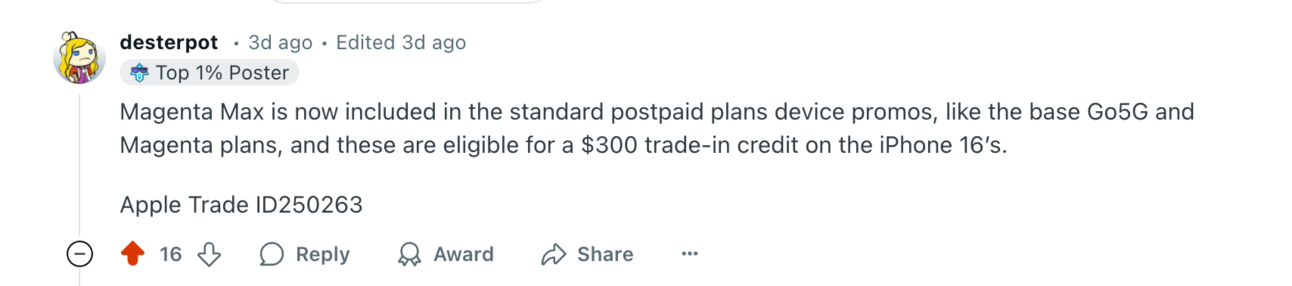 HOWEVER, I asked on Reddit, and it sounded like the Magenta MAX plan may now only be eligible for up to $300 off with a trade-in: