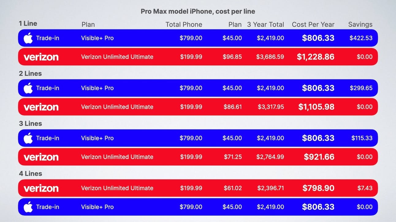 Only then do the free phone deals and multi-line discounts reduce the yearly cost to just under the cost of Visible+ Pro.