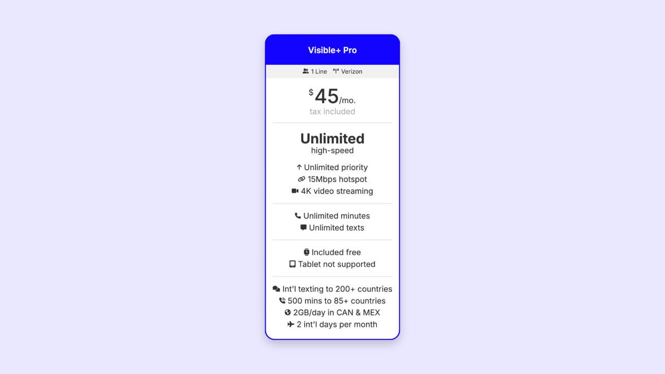 For example, the new Visible+ Pro plan has 90% of the same features as Verizon and costs HALF the price ($45/mo).