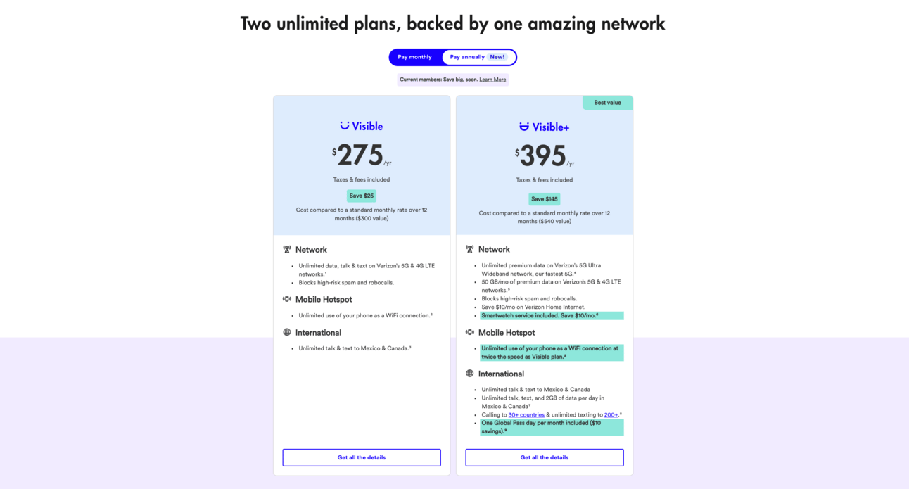 The new annual prices save you up to $145 (26% off) Visible’s plans.