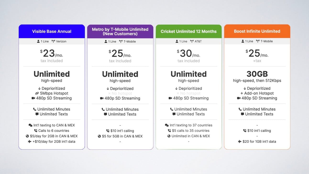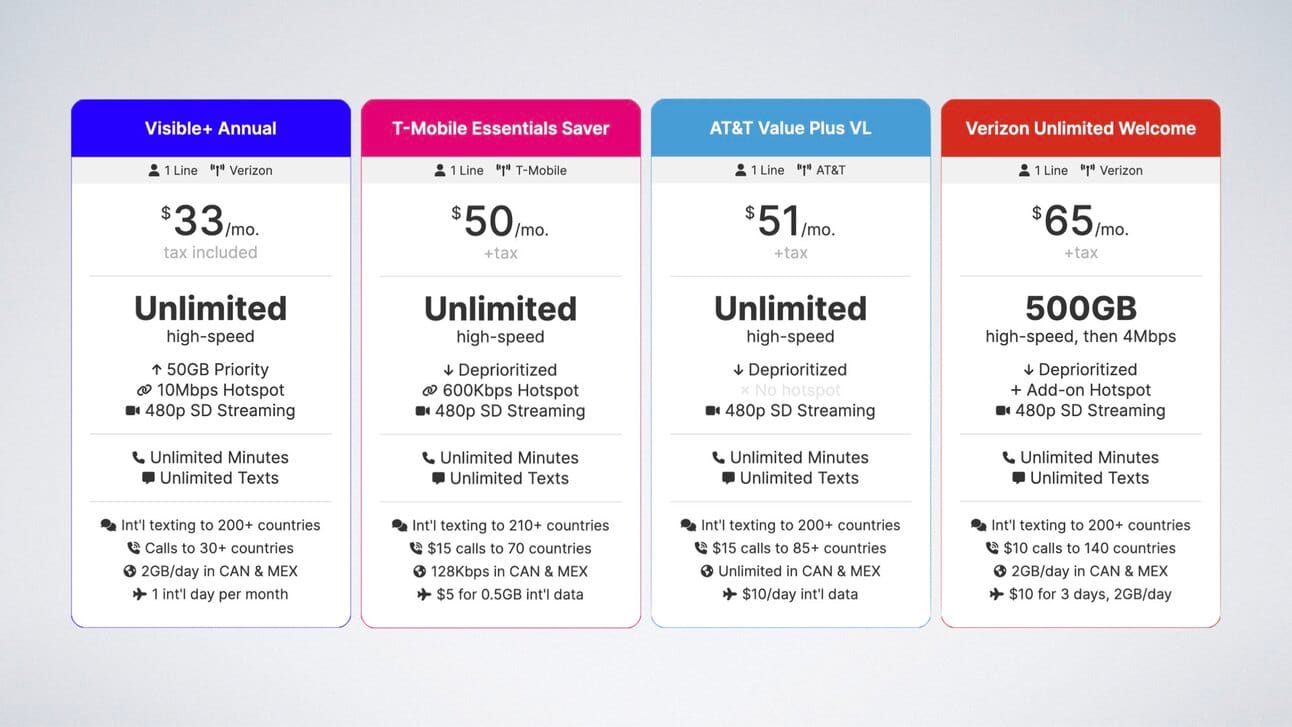Compared to the cheapest unlimited plans from T-Mobile, AT&T, and Verizon, Visible+ is more affordable and comes with more features: